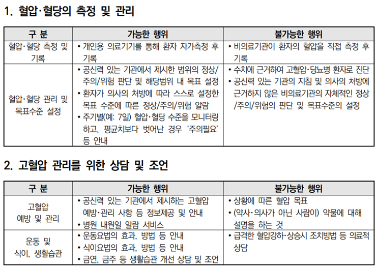 한편, 보건복지부는 의료법상 ‘의료행위’ 개념의 불명확성으로 민간의 건강 관리서비스 개발 및 제공에 어려움을 개선하고자, ‘비의료 건강관리 서비스 가이드라인(2022)’을 제시하여 비의료 기관에서 제공 가능한 행위를 구분하고 있다.