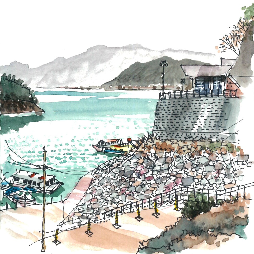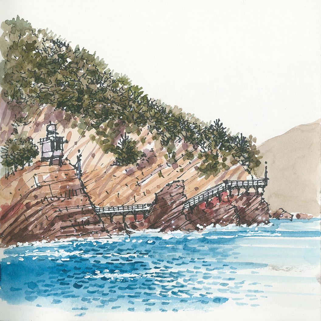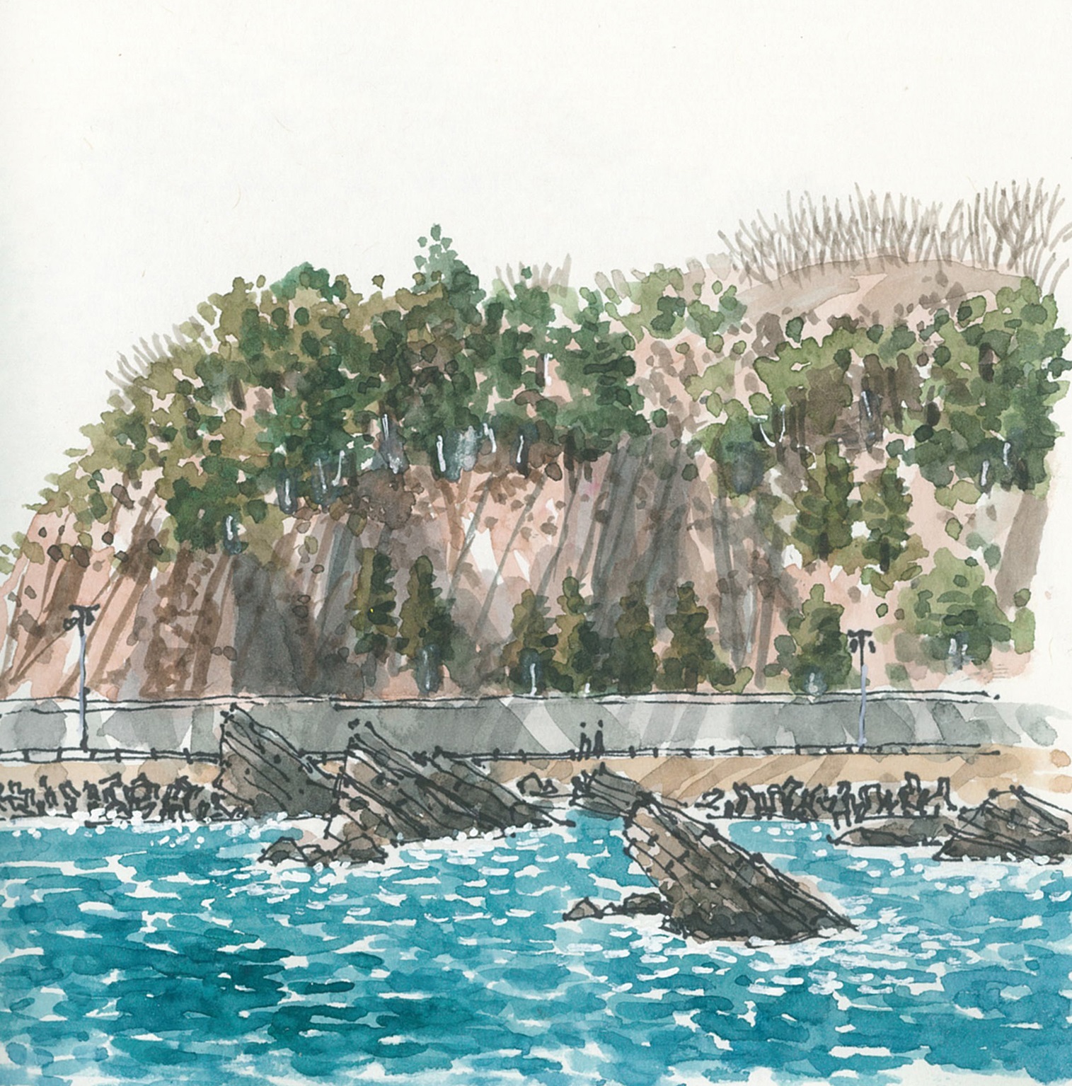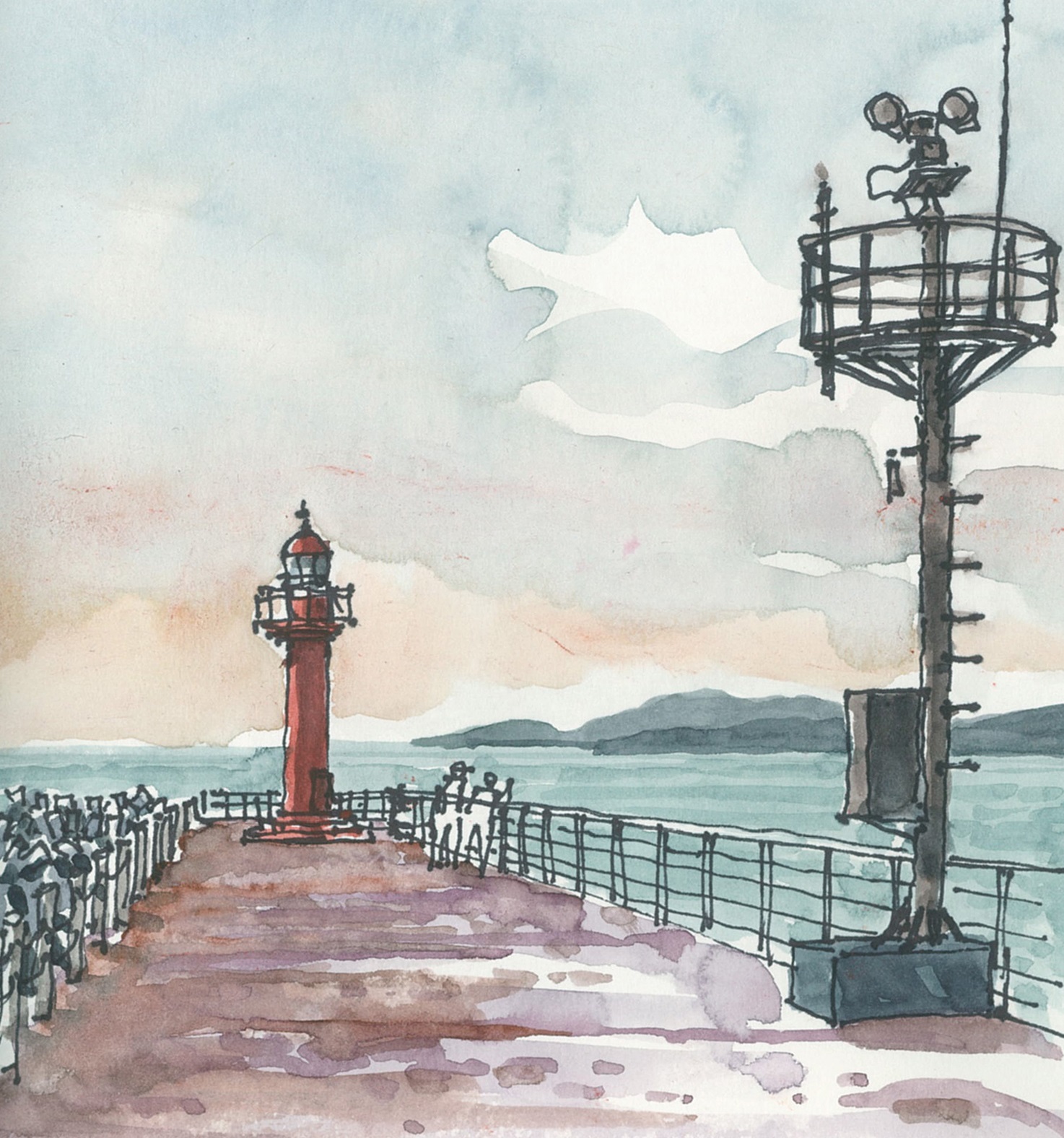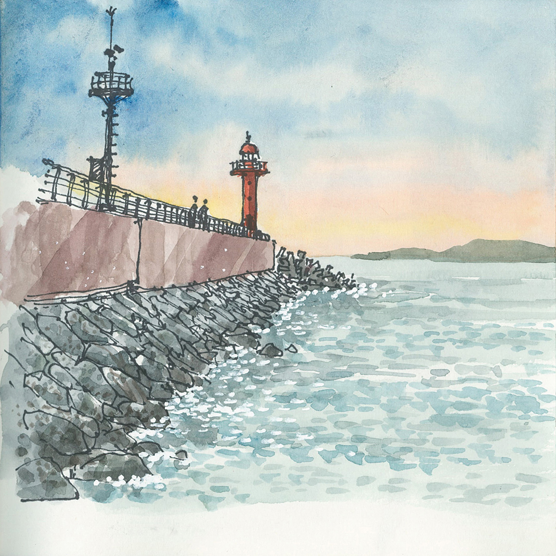 긴 방파제 옆구리에는 콘크리트로 제작된 테트라포드가 서로 몸을 엮어 지탱하고 있지만 오랜 세월, 스스로 파도를 이겨내는 견고한 자연석 바위와 비교하면 조악한 인공구조물일 뿐이다. 방파제 끝에는 붉은 등대 하나가 아이콘처럼 존재한다. 초록색에 가까운 바닷물과는 보색대비를 이루고 있는 붉은 등대를 향해 긴 방파제를 뚜벅뚜벅 걸어본다. 나의 느릿한 발걸음을 한가롭게 바라보며 허공 위에서 비행 중인 갈매기조차 시간이 정지된 듯 평화롭다.