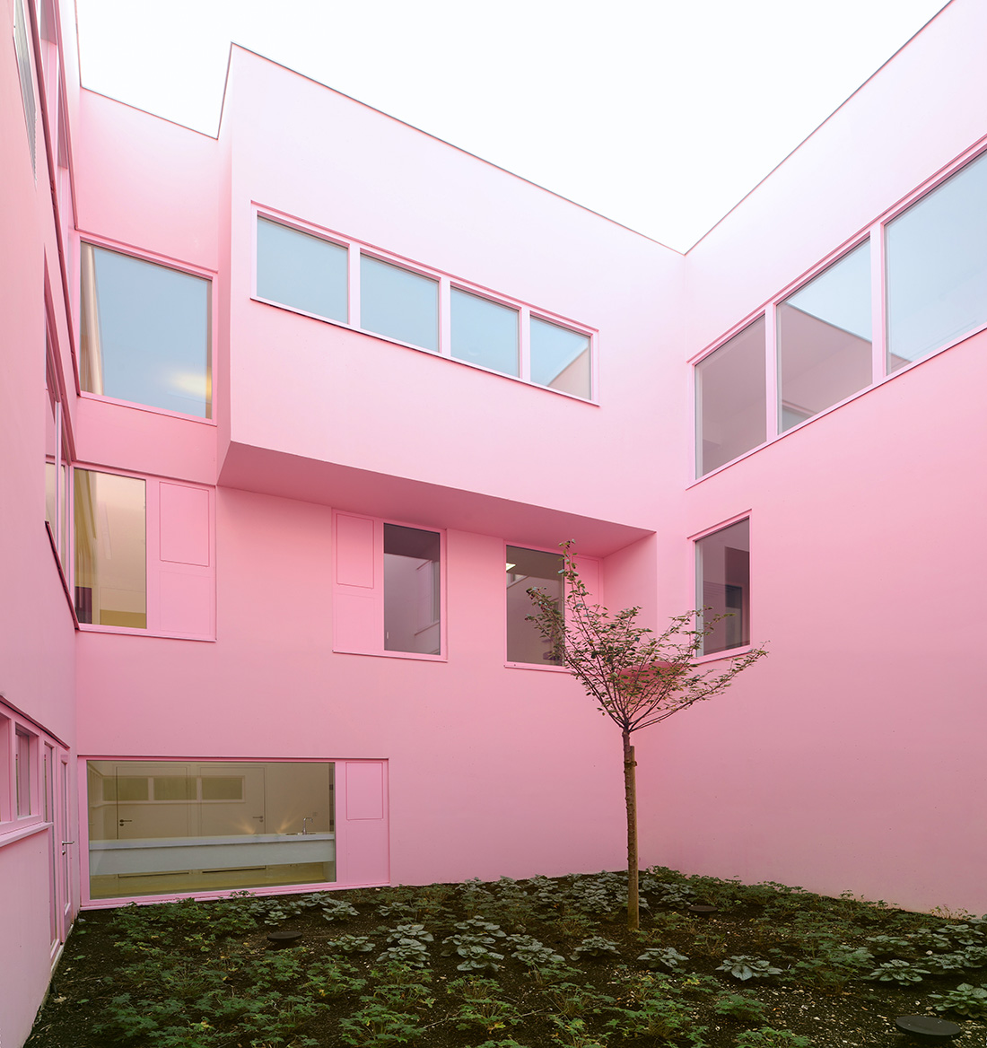 20㎡ 크기의 룸은 매우 세심하게 설계되었고, 베이 창문과 가구 배치의 조화는 외벽의 두께감을 더욱 강조해 준다. 옐로우와 핑크, 민트그레이의 세 가지 유형의 방은 다양성을 추구하고 있으며, 각기 다른 색상별로 태양의 움직임을 고려한 디자인이 돋보인다. 각자의 방에서 보이는 외부 에너지와 내부의 색채는 서로 조화를 이루며 노인 환자들에게 편안함을 주도록 연출된 점이 인상 깊다.