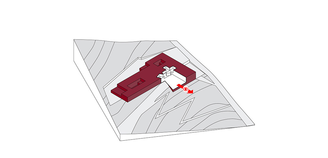 1) 건물은 경사면을 사용하여 풍경과 부드럽게 합쳐지도록 계획되었다.