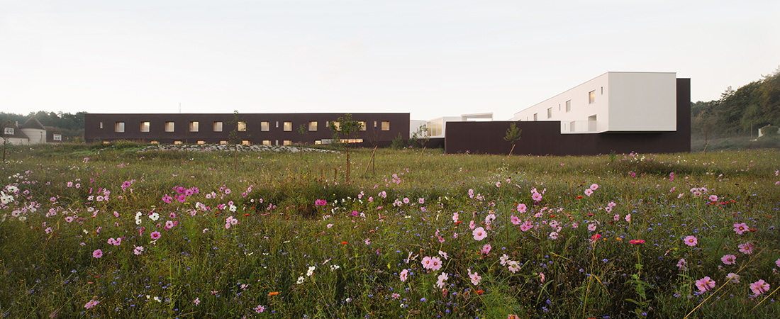 경사진 지형에 자연스럽게 어우러지도록 설계된 노인 요양원은, 92개의 거주자용 룸 + 1개의 게스트 룸(14개의 객실이 있는 알츠하이머 병동 1개), 접수 공간 및 애니메이션 센터, 의료 및 의료 상담실, 행정 및 직원실, 물류 및 기술실, 크롤 스페이스(천장이나 마루 밑의 배선·배관 등을 위한 좁은 공간)로 구성되어 있다. 입구는 마을 광장을 닮은 안뜰 주위에 배치되어 있으며, 욘느 계곡을 향하고 있다.