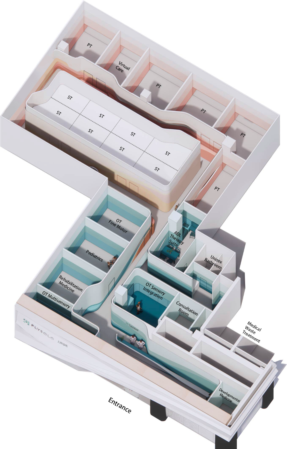 FlySolo 재활 의료 센터 설계의 핵심은 아동 환자의 필요이다. 때때로 의료 시설 방문은 아동에게 어느 정도의 불안감을 유발할 수 있으며, 긍정적인 주의를 환기시키는 요소가 없다면 불안감은 더욱 커질 수밖에 없다. 이러한 이유로 센터 설계는 아동이 놀고, 탐험하고, 움직이고, 발견하고자 하는 욕구를 최대한 반영했다.