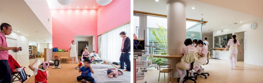 한 켠에 평상과 같은 공간을 마련한 거실(교토부 마이즈루 어린이 치료교육센터) / 둥근 기둥을 이용한 스태프의 업무 코너 (교토부 마이즈루 어린이 치료교육센터) @ZOOM Satoshi Asakawa (두 사진 모두) 모든 프로젝트마다 아마추어인 상황에서 출발한다