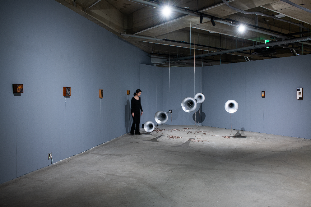 《생태의 집 – 한옥》김준, 유동-고요의 울림, 2025, 혼합 재료(혼 스피커, 엠프, 목재, 2채널 사운드), 가변크기
