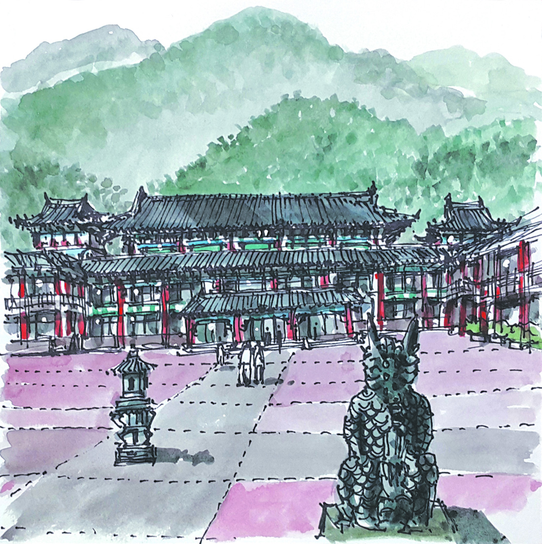 중국 서안 도교사원 중국의 명산 5 악 중 하나인 화산 답사는 또 하나의 경이로운 경험이다. 산을 오르기 전에 도교 사원에 들러 복을 빌고 몸과 마음을 정결하게 하는 예식에 참예 해보는 것도 추천할 만 하다. 화산의 산맥을 배경으로 하고 전통적인 기와지붕과 붉은 열주로 이루어진 중정은 이른 아침 방문객들은 환영하는 악기 소리에 침묵을 깨고 예식이 시작된다. 이곳에서 세상 인연과 결별하고 혹독한 자기 수련과 끝없는 정진을 통하여 신선이 되는 길을 선택한 수련생과 도사들의 삶을 잠시 엿볼 수 있다. 동방불패나 소오강호같은 무협영화에서 나오던 화산파, 전진파, 무당파 등이 활약하던 중국 도교의 발상지인 만큼 축지법, 혹은 장풍을 구사하는 무예의 고수들이 최고의 무공 비록인 규화보전을 전수하며 어디선가 은둔하고 있을지도 모르겠다는 엉뚱한 상상을 해본다.