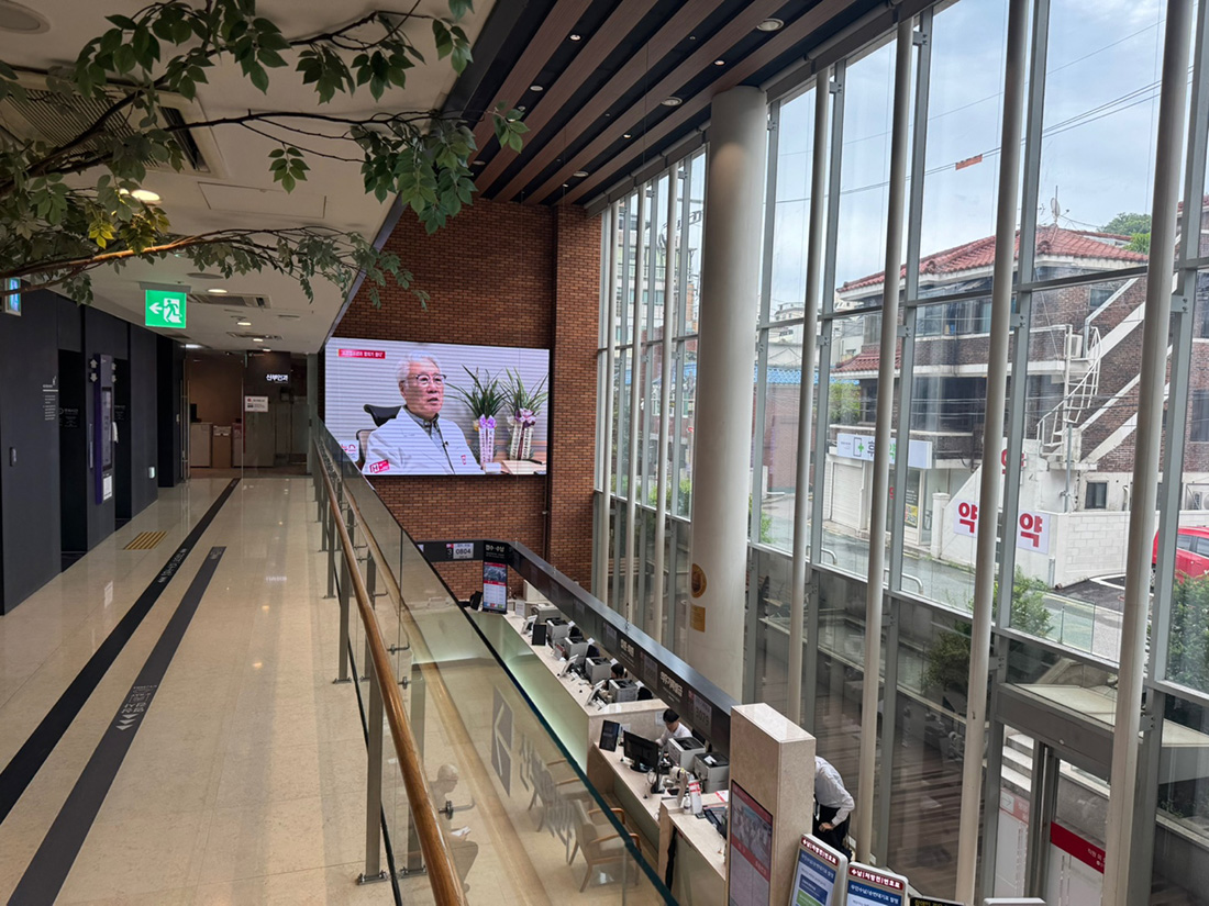 또한 수차례 증축과 개축을 거쳤음에도 불구하고, 사이니지 디자인의 일관성을 철저히 유지함으로써 병원 브랜드 아이덴티티를 안정감 있게 전달하고 있다. 병원 내 각종 게시물 또한 디지털 방식으로 통합 관리되어, 수시로 변경되는 환자 정보 역시 깔끔하고 통일된 서체로 제공된다.