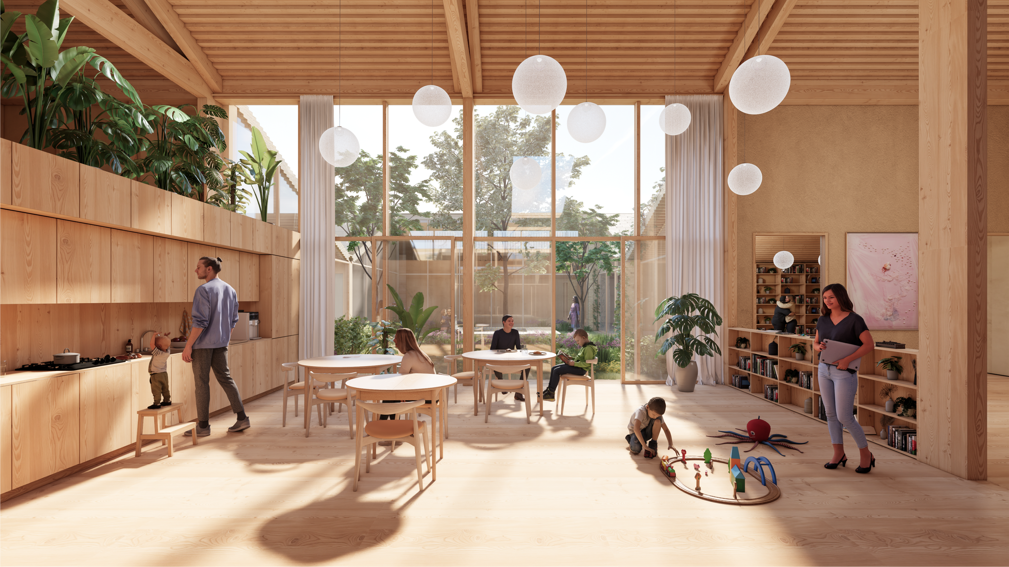 24052_Nyt byggeri til Sankt Lukas Hospice og Lukashuset Hellerup_Courtyard Garden 안으로 들어서면 푸른 안뜰 정원이 내려다보이는 탁 트인 로비가 방문객들을 맞이한다. 두 건물 중앙에 위치한 하트 공간은 공동체 의식과 웰빙을 위한 모임 공간을 제공한다. 루카슈셋의 패밀리룸은 프라이버시와 개방감을 모두 누릴 수 있는 공간과 놀이와 사색을 위한 활동 공간을 제공한다. 한편, 성인 호스피스에는 활동과 회의를 위한 더 넓은 공용 공간이 마련되어 있다.